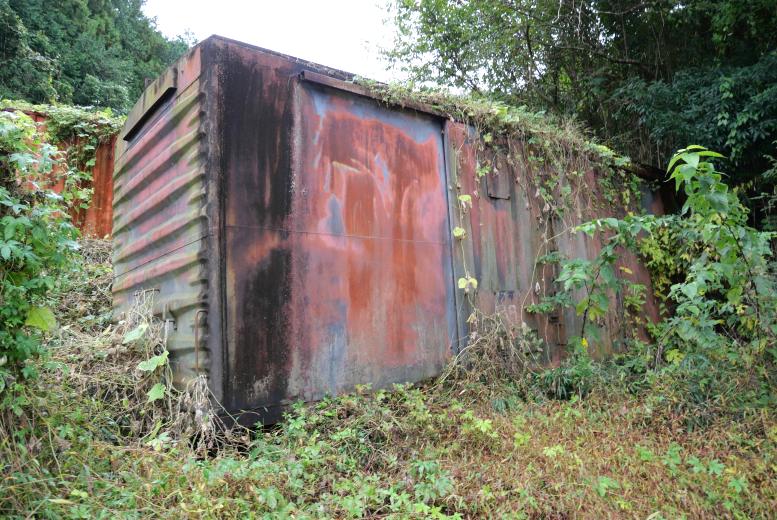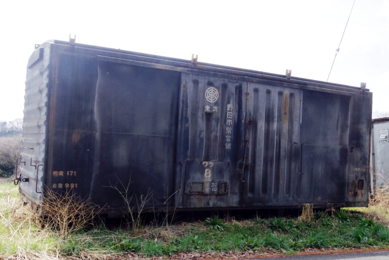 東武ワラ1形で車体のみ利用の場合 このように地面から浮いて置かれて いることがよくある(壬生町内の例)。 国鉄貨車の場合地面に直接置く 場合がほとんどなのでこれも識別に。 |